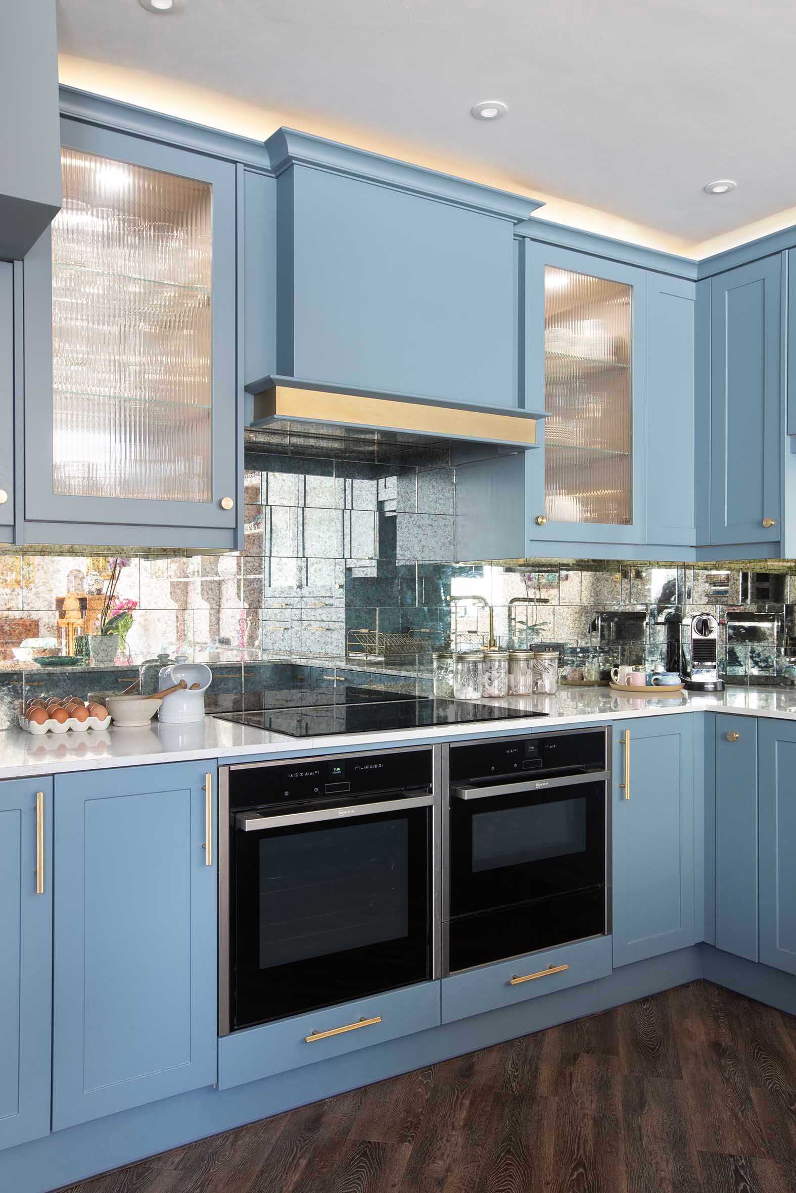 This included a variety of additional lights and reeded glass cupboards. As well as antique mirrored tiles and brush gold fixtures to help reflect the light around the space. We also chose a classic Wedgewood blue to ensure the cabinetry was neither stark nor dark.