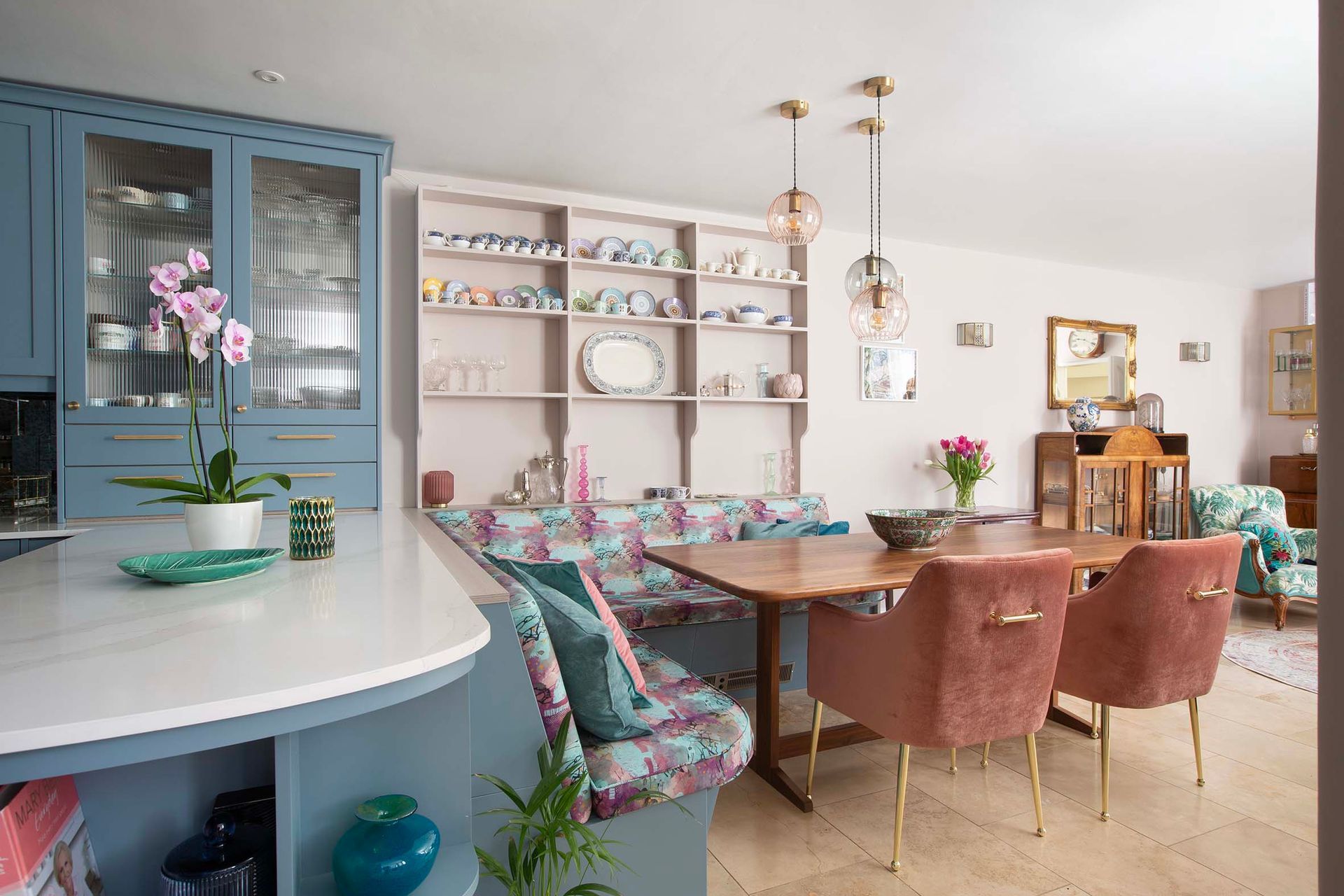 The design included upholstered balconet seating with a shelving display area and built-in seating to help open up the dining area. This created more space making the room perfect for entertaining. We also commissioned a bespoke refectory table from