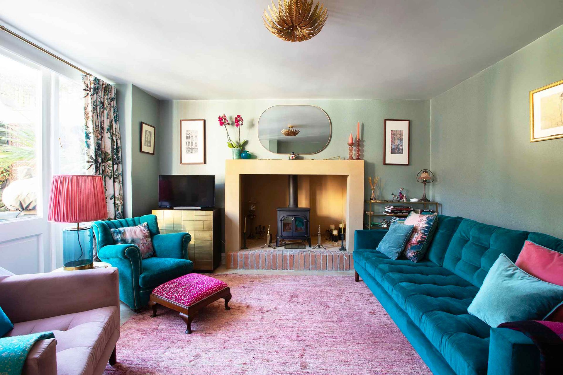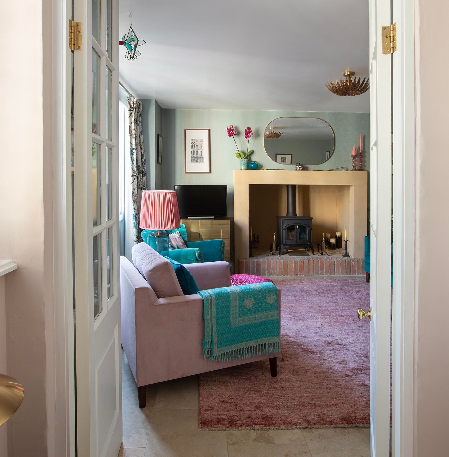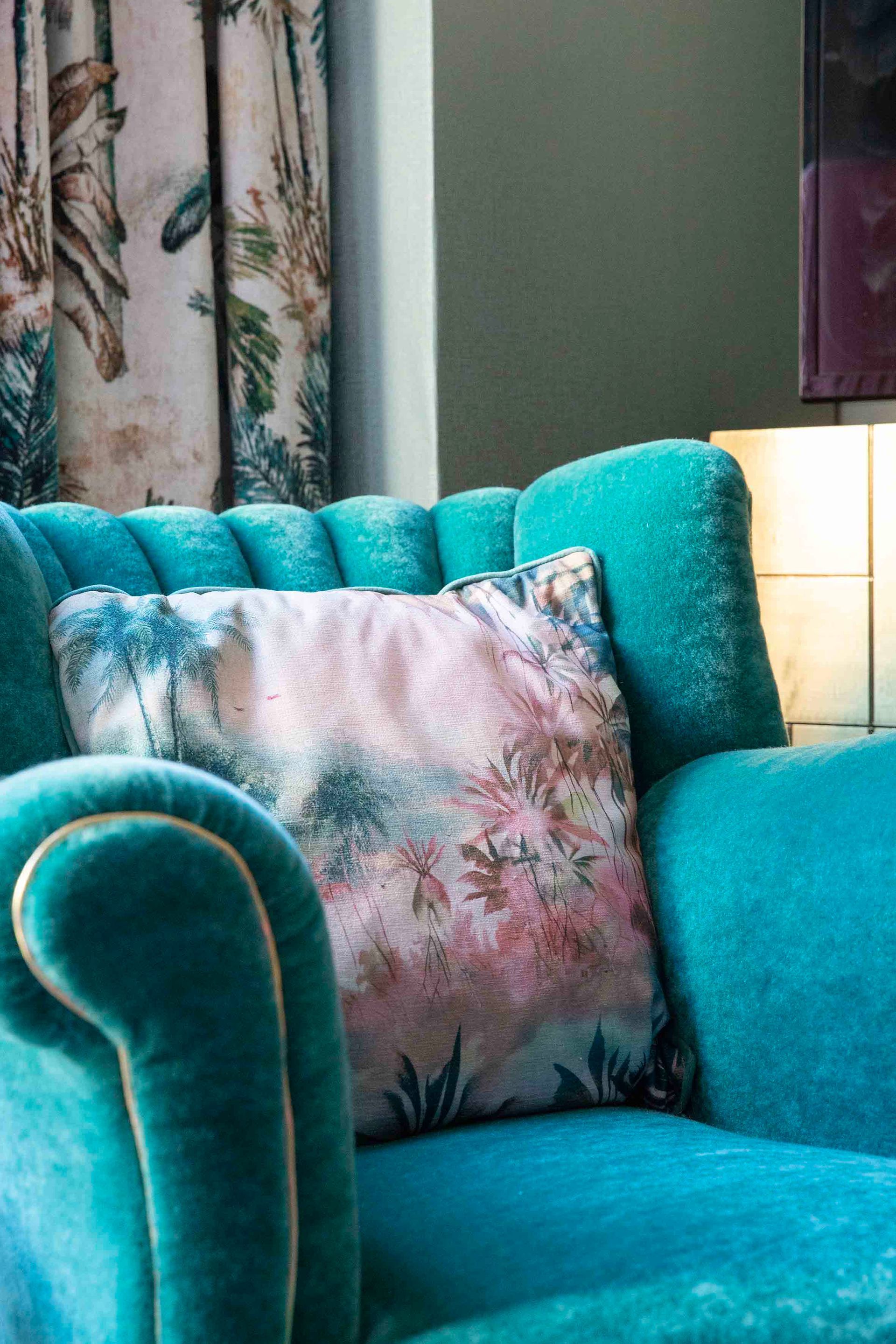 Particularly successful design elements here include a rich metallic teal wallpaper, a deep teal sofa for extra seating and the reupholstering of existing chairs in dusky pink. To finish the look and keep the space cosy we added a pale pink silk rug and bespoke botanical curtains to frame the garden view.