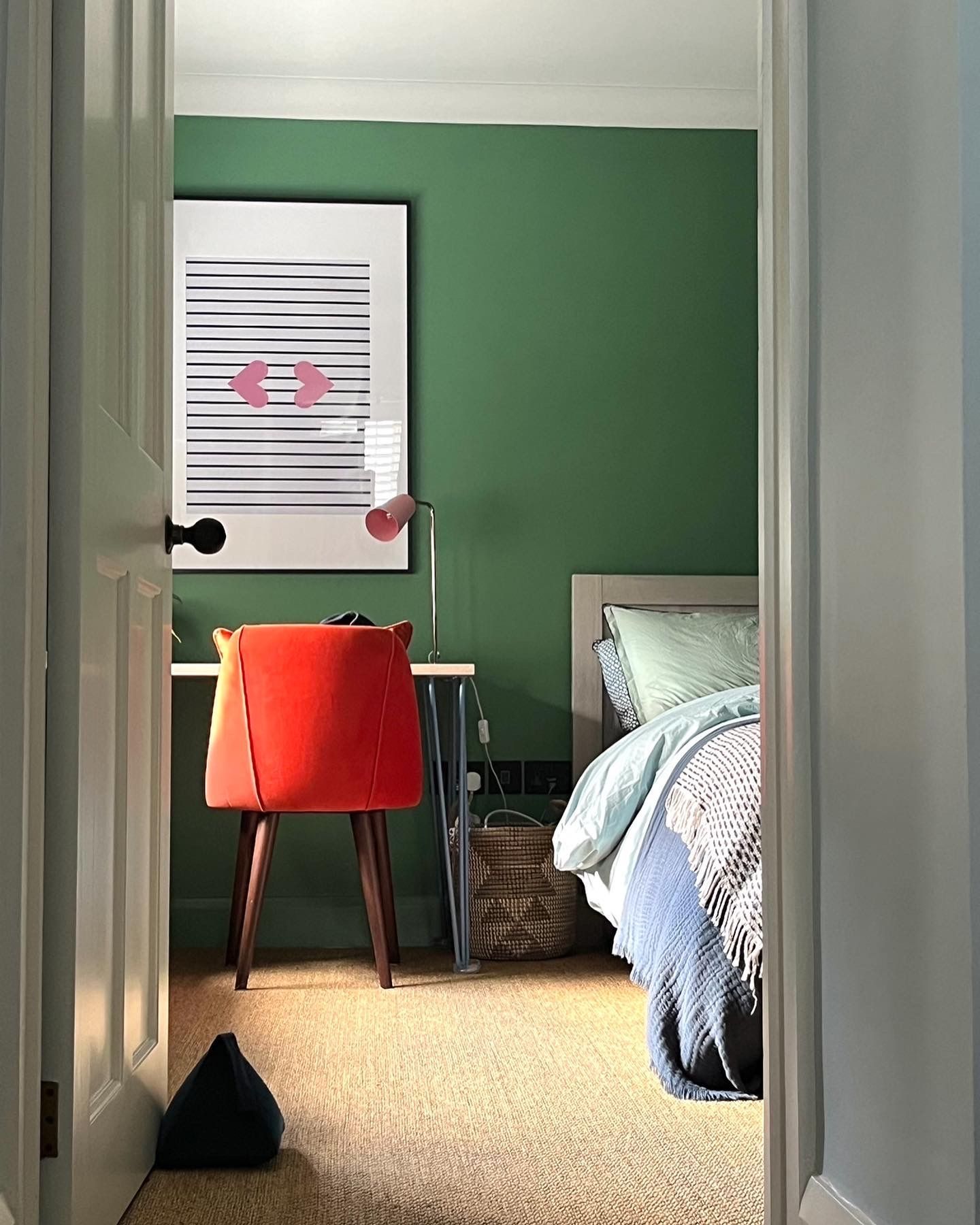 It was important to us that the garden room cum office blended into the landscape of the garden rather than sticking out or making a statement. That’s why we opted for a cedar clad structure decorated in dusky blue greens.